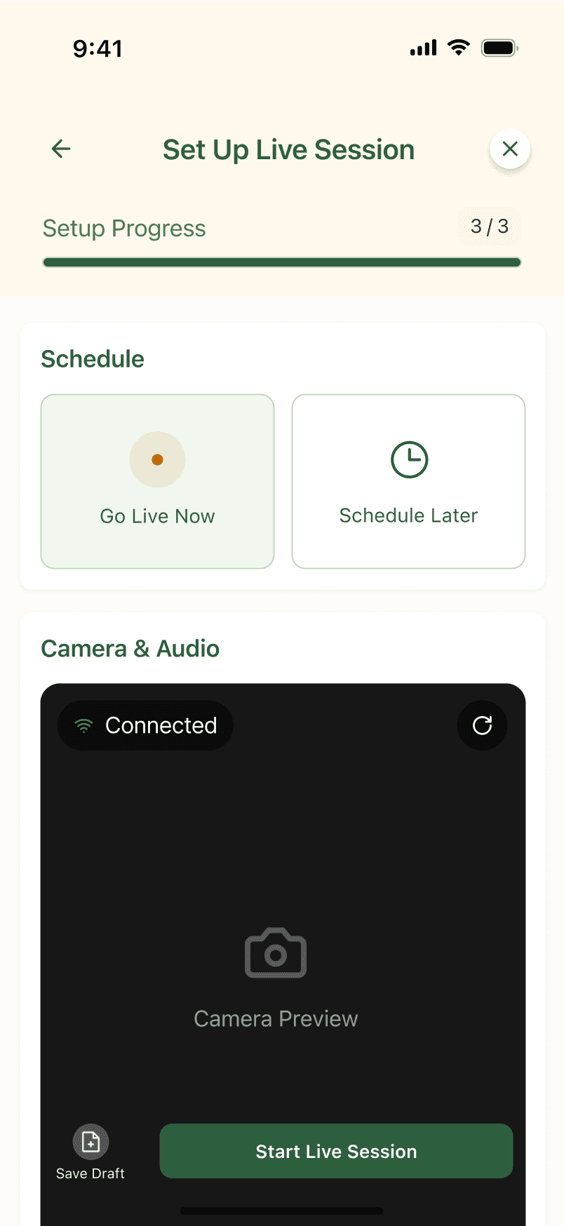 42.9% of our users navigated to the wrong destination but was able to find the correct feature. Instead of separating current session and future sessions, date selection will be available after users click into setup live session.